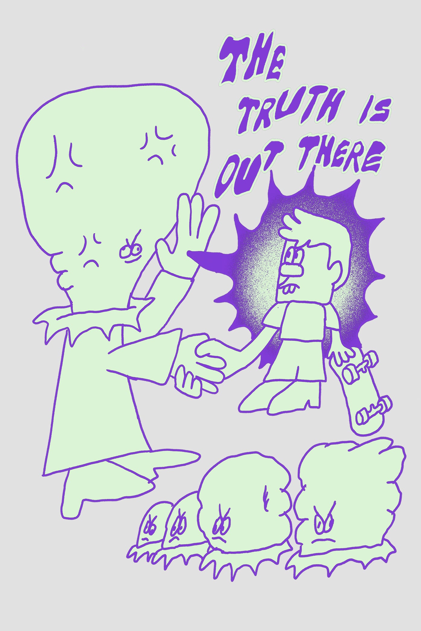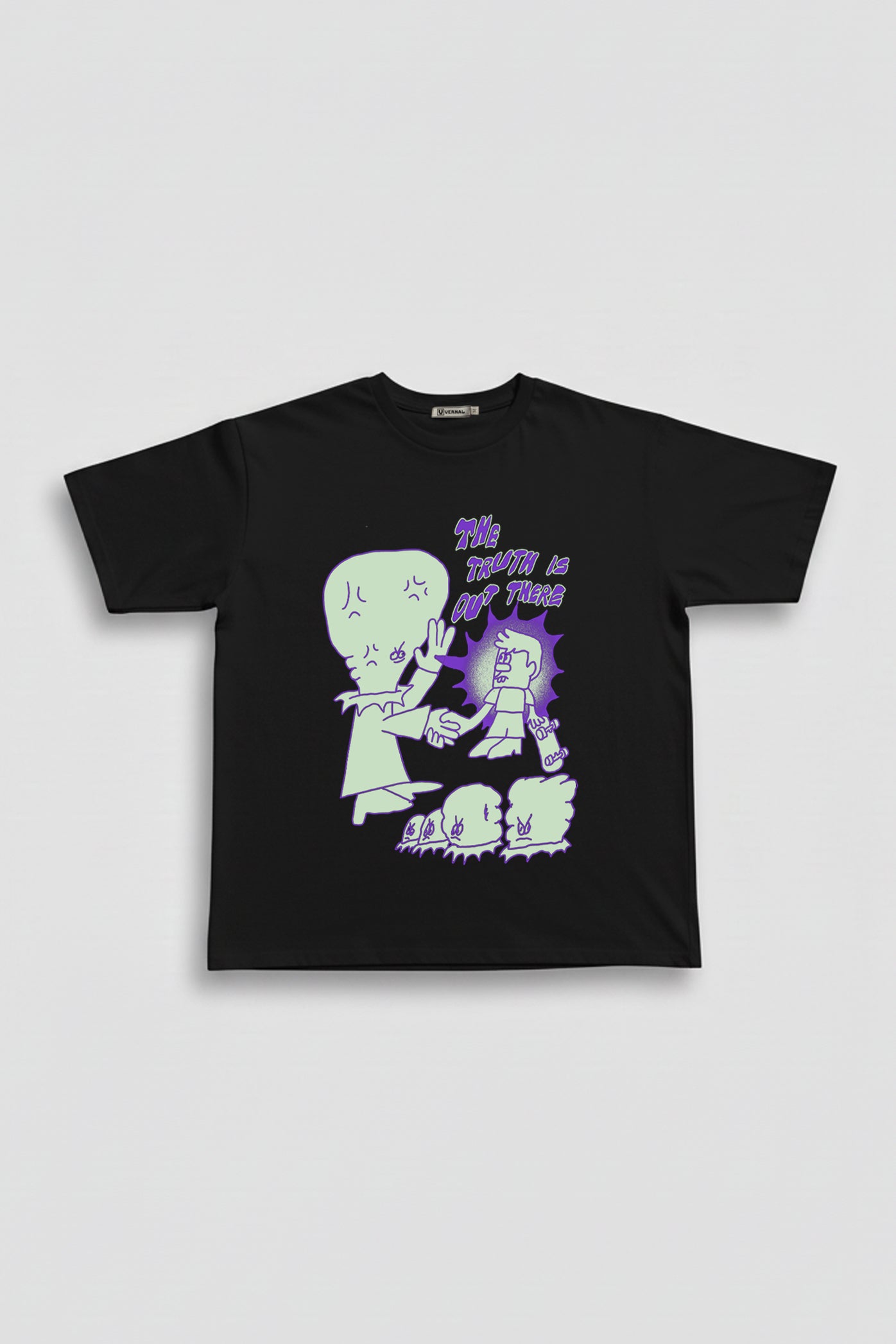Esta remera es un pequeño universo paralelo: un alien con cara de pocos amigos, un skater iluminado por una verdad cósmica y una patrulla de criaturas que no sabemos si están vigilando… o conspirando.