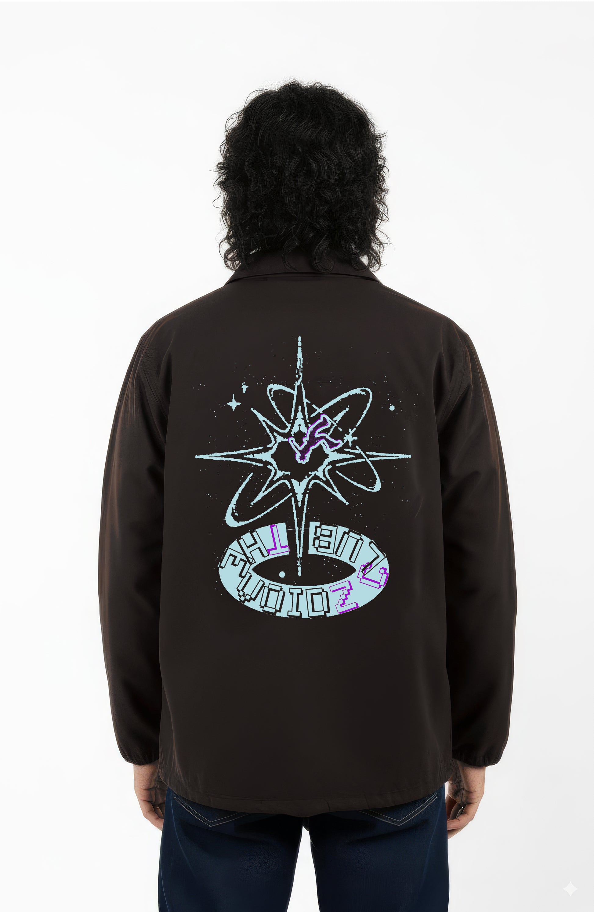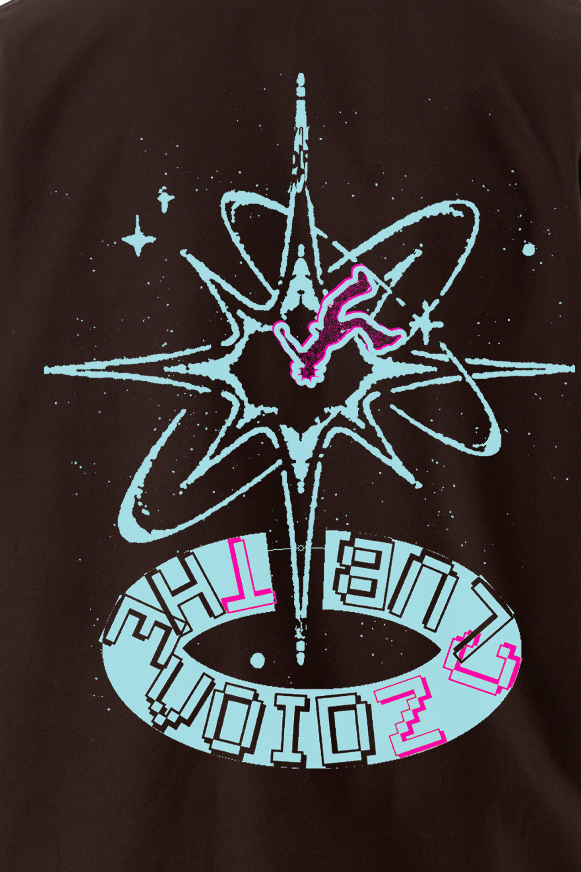 Una campera de energía retro-futurista: tipografía glitch, un ser orbitando y una estampa cósmica que convierte la espalda en un póster en movimiento. Hecha para la calle, para el día y para la noche.