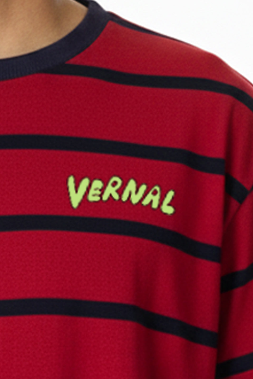 El diseño a rayas horizontales en rojo y azul marino se equilibra con el logo Vernal en contraste verde ácido, aportando un toque de frescura retro.