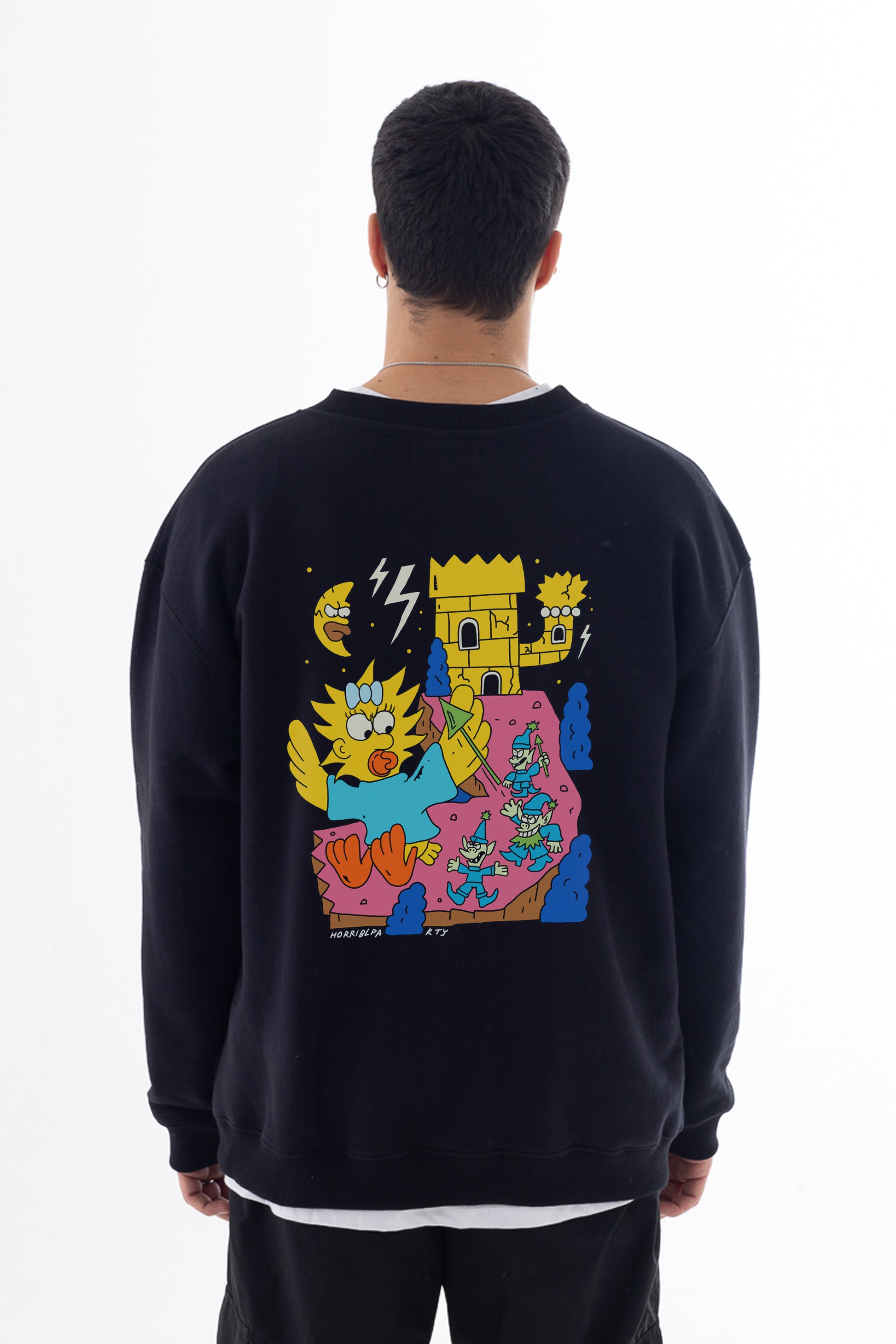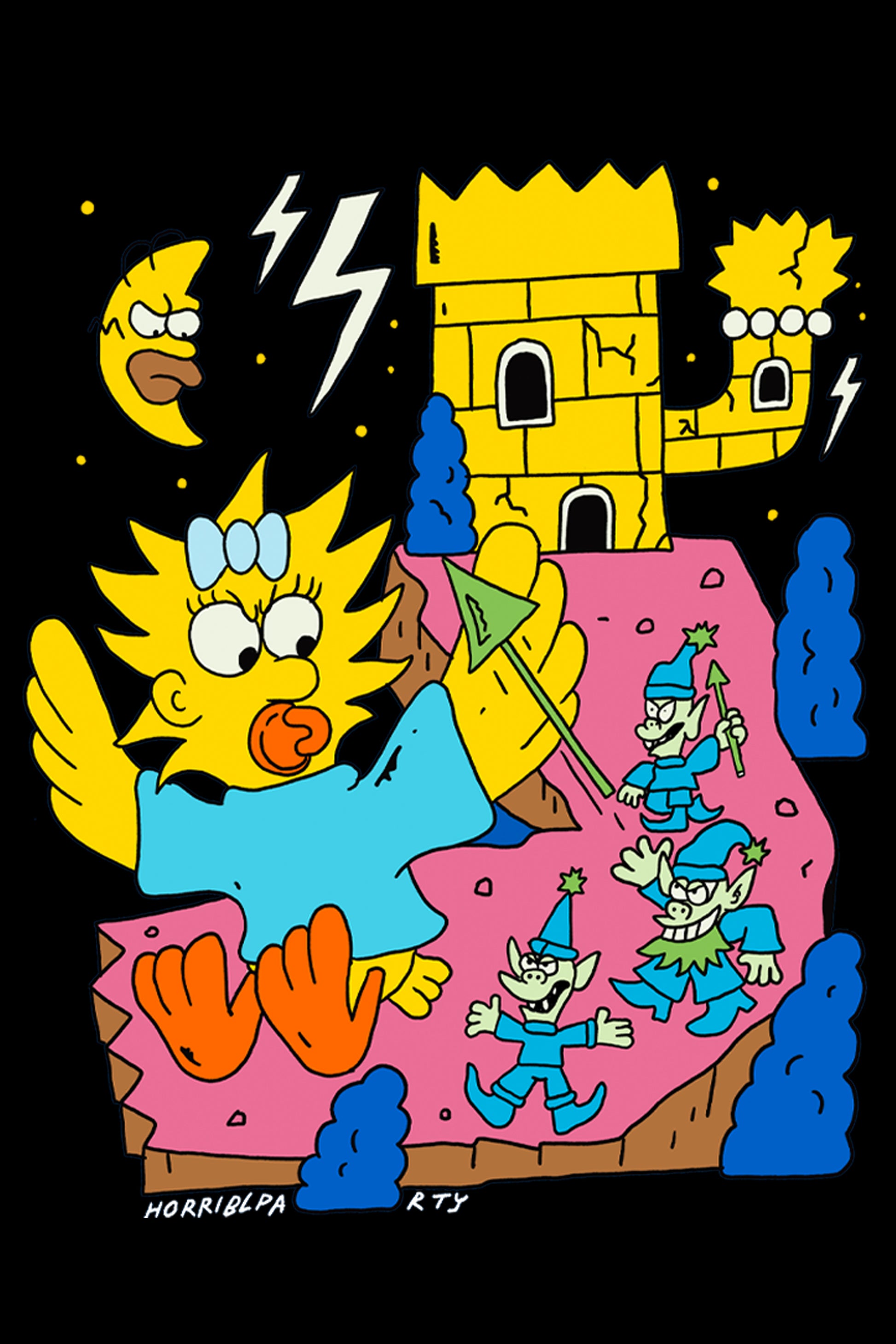 En colaboración con @HorriblParty, llega esta pieza que reinterpreta el universo amarillo en clave ácida, caótica y ultra pop. Maggie en modo gigante, una torre eléctrica, duendes, rayos y un cielo perturbador: un estallido visual que desarma la infancia y la vuelve arte de culto.